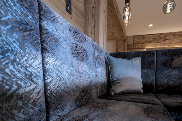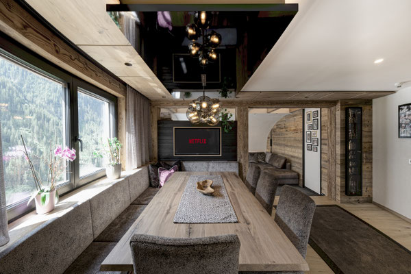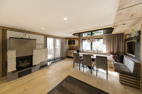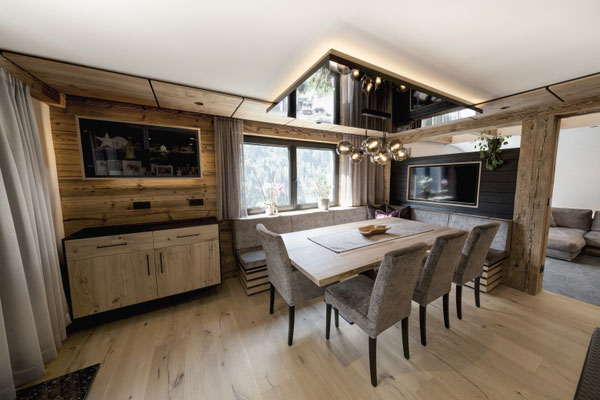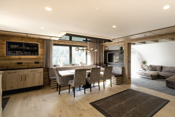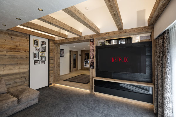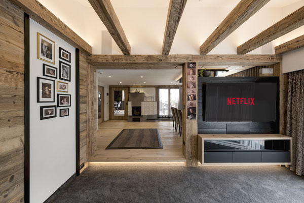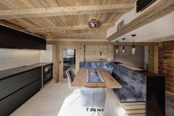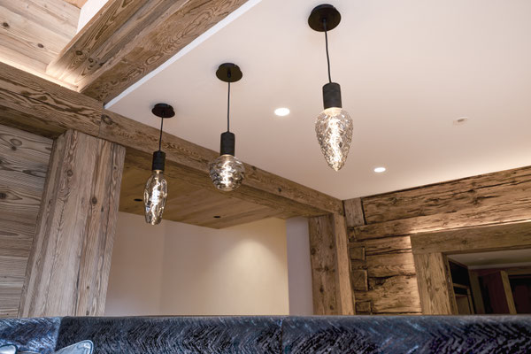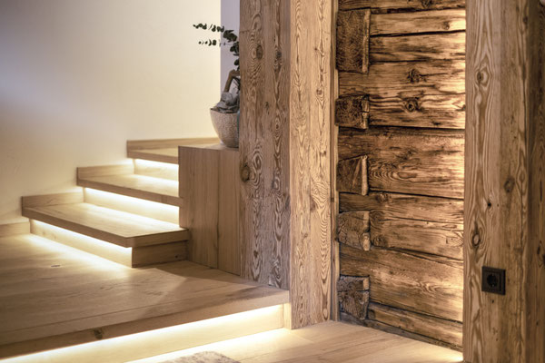 Kernteil des Hauses stammt aus den 1850er Jahren. Blockwände aus dieser Zeit wurden gebürstet und mit LED in Szene gesetzt. (ehemaliger Stall)